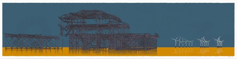 Brighton West Pier and Rampion Wind Farm Antique Ochre and Blue By Alej ez